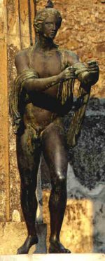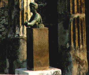 Apollostatue zum Altar Vor der dritten Säule links vom Eingang fand man einen Venusaltar samt Statuette. Rechts gegenüber stand ein Hermaphrodit ohne Altar und auf der rechten Längsseite wiederum vor der dritten Säule eine grosse Bronzestatue des bogentragenden Apollo. Auf ihrer Basis fand man den in oskischer Sprache eingeritzten Familiennamen Mummius. Die öfters geäusserte Vermutung, die Apollobronze stamme aus dem korinthischen Beuteschatz des Censors Lucius Mummius von 146 v.Chr., ist nicht haltbar, zumal der Name bloss eingeritzt worden war und keine offizielle Inschrift darstellte. Weiter auf der rechten Seite bei der fünften Säule gab es eine jugendliche Herme des Mercurius, der in ein weites, über den Kopf gezogenes himation (grch. Umhang) gehüllt ist. Auf der linken Seite stand vor der dritten Säule einmal eine Statue der bogentragenden Diana samt Altar. Von ihr blieb lediglich eine Büste erhalten. Äquivalent zur rechten Seite könnte auch links eine Herme gestanden haben, doch fanden sich hiervor keine Reste.